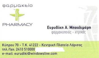 Υπ/νος: Ευρυδίκη Μπουλιμάρη Δ: Κύπρου 70, Κεντρική Πλατεία, τ.κ 41222, Λάρισα T: 2410510000 | E: eurudiki@windowslive.com