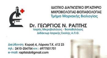 Το ιδιωτικό διαγνωστικό εργαστήριο του Ιατρού Βιοπαθολόγου ‐ Μικροβιολόγου Ράπτη Γιώργου λειτουργεί από το 2010 στη Λάρισα, και από το 2013 στην Αγιά. Στόχος του είναι η παροχή υπηρεσιών υγείας υψηλής ποιότητας με σεβασμό στον κάθε εξεταζόμενο.