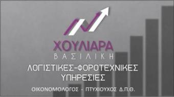 Το Λογιστικό - Φοροτεχνικό Γραφείο ΧΟΥΛΙΑΡΑ ΒΑΣΙΛΙΚΗ που εδρεύει στην Πρωτοπαπαδάκη 10, Λάρισα (Πλ. Ταχυδρομείου) προσφέρει με συνέπεια και αξιοπιστία ολοκληρωμένα πακέτα λογιστικών και φοροτεχνικών υπηρεσιών ικανά να στηρίξουν κάθε μορφής και μεγέθους επιχείρηση.
